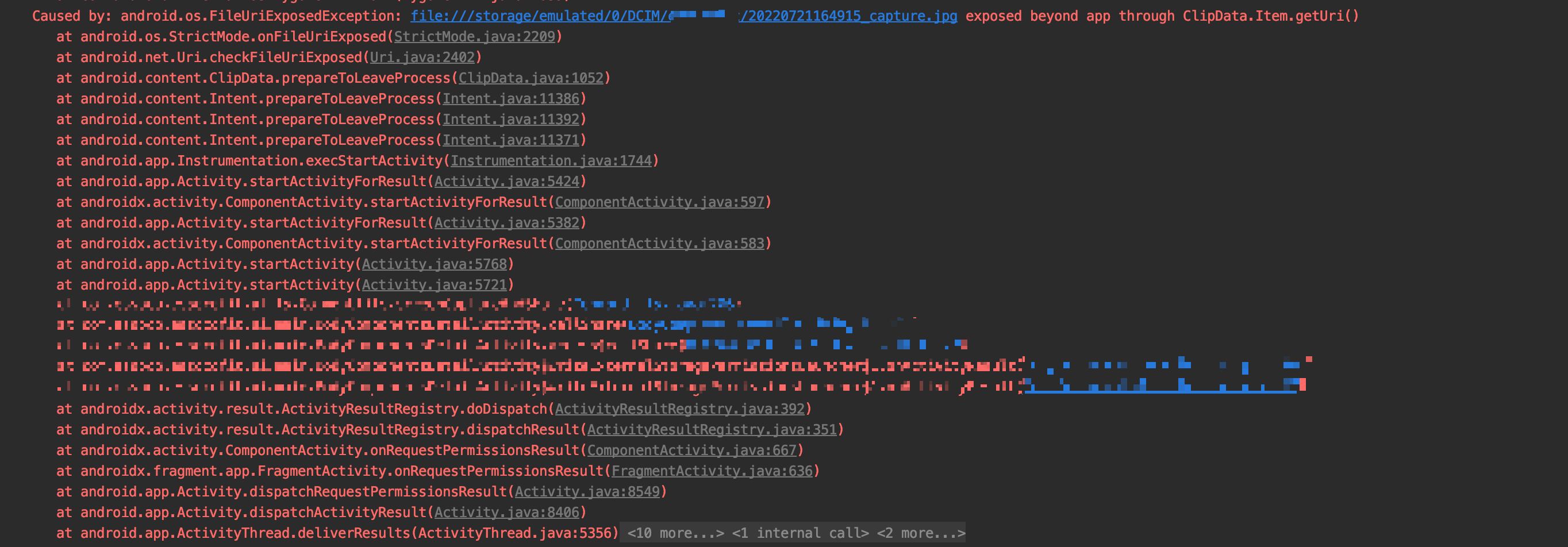 찾아보니 Android 7.0 이상의 경우 앱 외부에 file://URI의 노출을 금지하기 때문에 FileUriExposedException 이 발생한다.