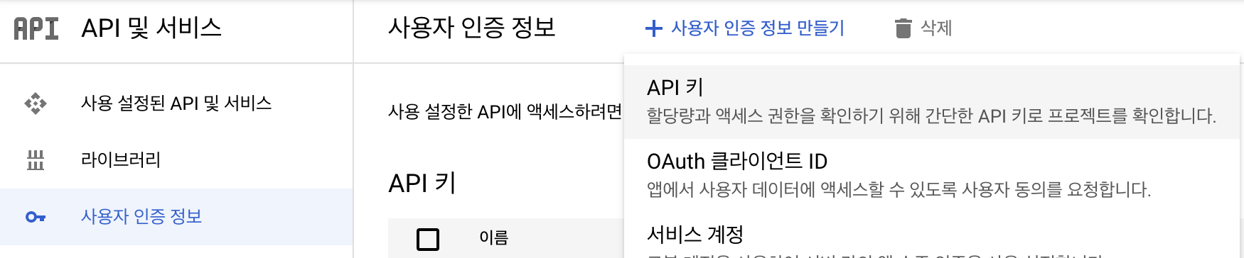 - 상단에 '+사용자 인증 정보 만들기'를 선택한다.